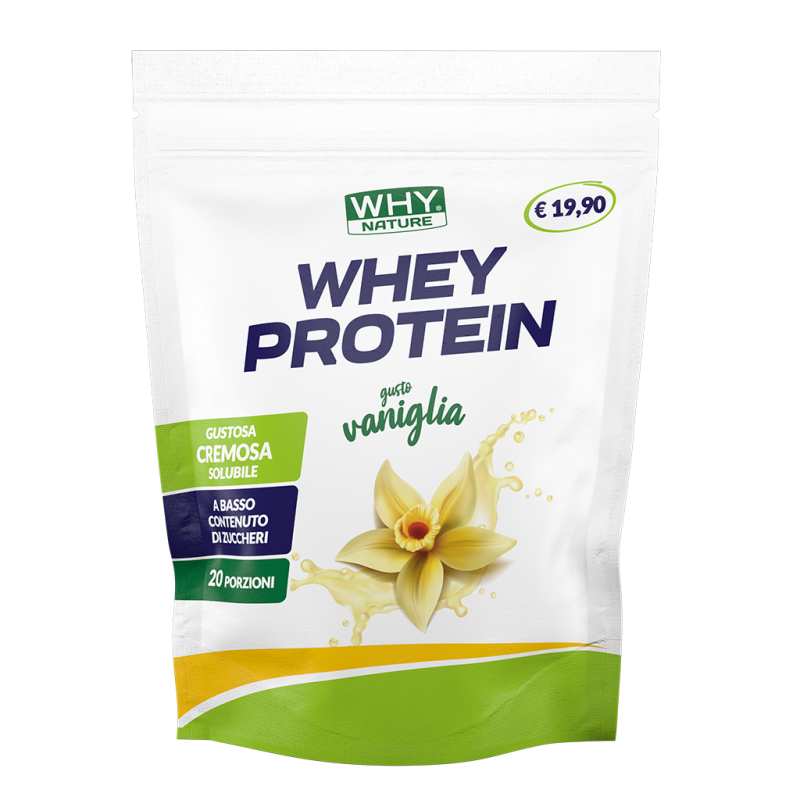 WHEY PROTEIN di WHY Nature è un gustoso e cremoso preparato alimentare per bevanda proteica a base di proteine concentrate del siero del latte, a basso contenuto di zuccheri e ad elevato contenuto di proteine. Ideale per chi vuole iniziare ad integrate le proteine alla propria dieta ma anche per chi è alla ricerca di un supporto proteico per la crescita e il mantenimento della massa muscolare. Disponibile nel formato da 400 g (corrispondenti a 20 porzioni) nei gusti: cioccolato, vaniglia, latte e biscotti, cocco ciok.