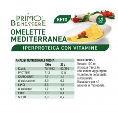 Ingredienti: Bianco e tuorlo d'uovo in polvere (44%), proteine del LATTE (emulsionante: lecitina di SOIA), ortaggi disidratati (pomodoro, cipolla, peperoncino) (5,1%), spezie ed erbe aromatiche (paprika,curcuma, prezzemolo, timo, aglio, pepe, basilico, origano,maggiorana), sale, aromi, antiagglomerante: carbonato di magnesio, vitamine (C, B3, E, B5, B6, B2, B1, A, B9, B8, B12), maltodestrine. Può contenere tracce di glutine,crostacei,soia,frutta a guscio e sedano.