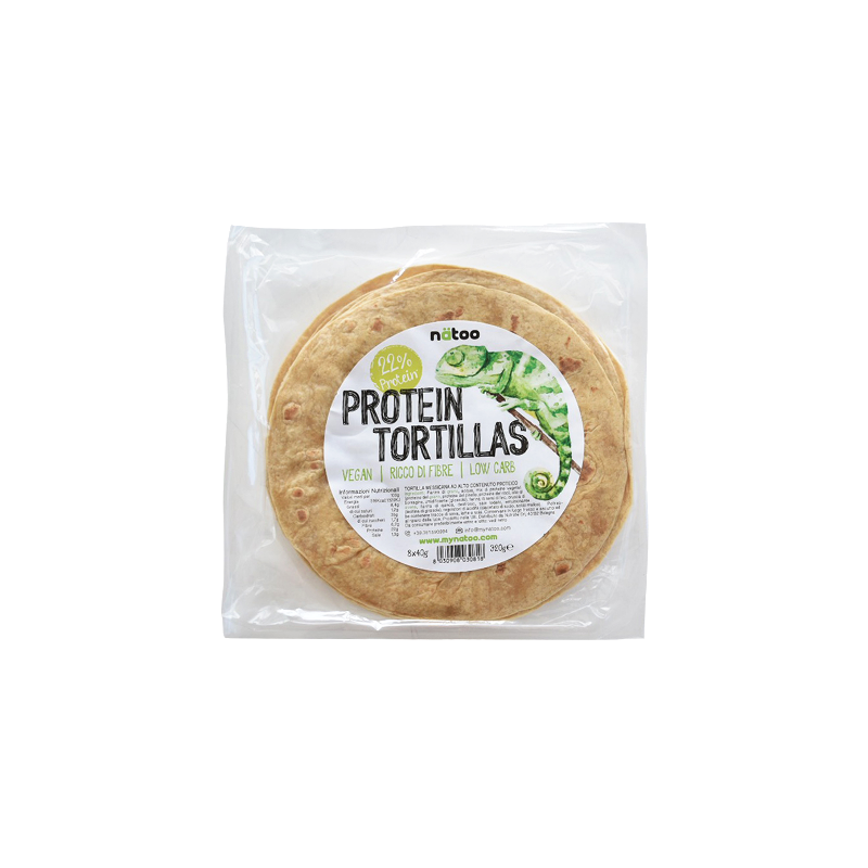 Tortillas messicane alto contenuto proteico ricco di proteine vegetali (proteine del grano, proteine del pisello, proteine del riso) con farina di semi di lino, crusca di avena e farina di quinoa. La confezione contiene 8 tortillas da 40g cadauna. Le Protein Tortillas di Natoo sono deliziose tortillas messicane proteiche ricche di fibra, ideali per preparare piatti tipici della tradizione messicana come tacos e burritos oppure come snack o come sostituto del pane in abbinamento ad altri cibi, in qualsiasi momento della giornata. Ben 22% di proteine Solo 8,4% di grassi Alternativa deliziosa per uno spuntino “diverso” Vegan