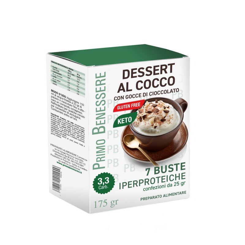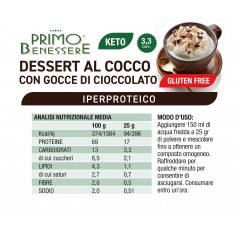 Ingredienti:Proteine del latte (emulsionante:lecitine),scaglie di cioccolato(saccarosio),massa di cacao,cacao magro in polvere, grassi del latte,emulsionante: lecitina di soia),aroma naturale di vaniglia) ( 9%) yogurt magro in polvere,amido modificato,cocco grattuggiato (2%) addensanti: carragerine e gomma di xantano,sale,aromi,antiagglomeranti:magnesio e potassio carbonati,adulcorante:sucralosio.Può contenere tracce di uova,pesce, frutta a guscio,sedano.