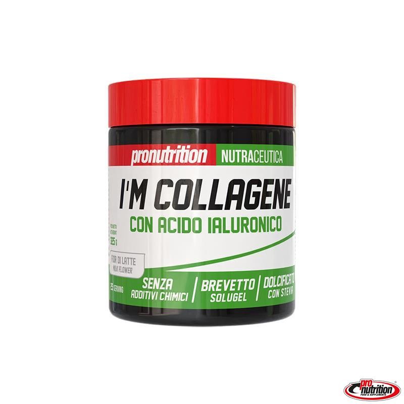 I’M collagen Pronutrition è un integratore a base di collagene peptidico, ottenuto per idrolisi enzimatica, a basso peso molecolare SOLUGEL, certificato grass feed addizionato con acido ialuronico,estremamente gradevole al palato grazie alla delicata aromatizzazione al fiordilatte Tale formulazione combina i benefici del collagene e dell’acido ialuronico per offrire un supporto completo alla salute della pelle, delle articolazioni e dei tessuti connettivi.