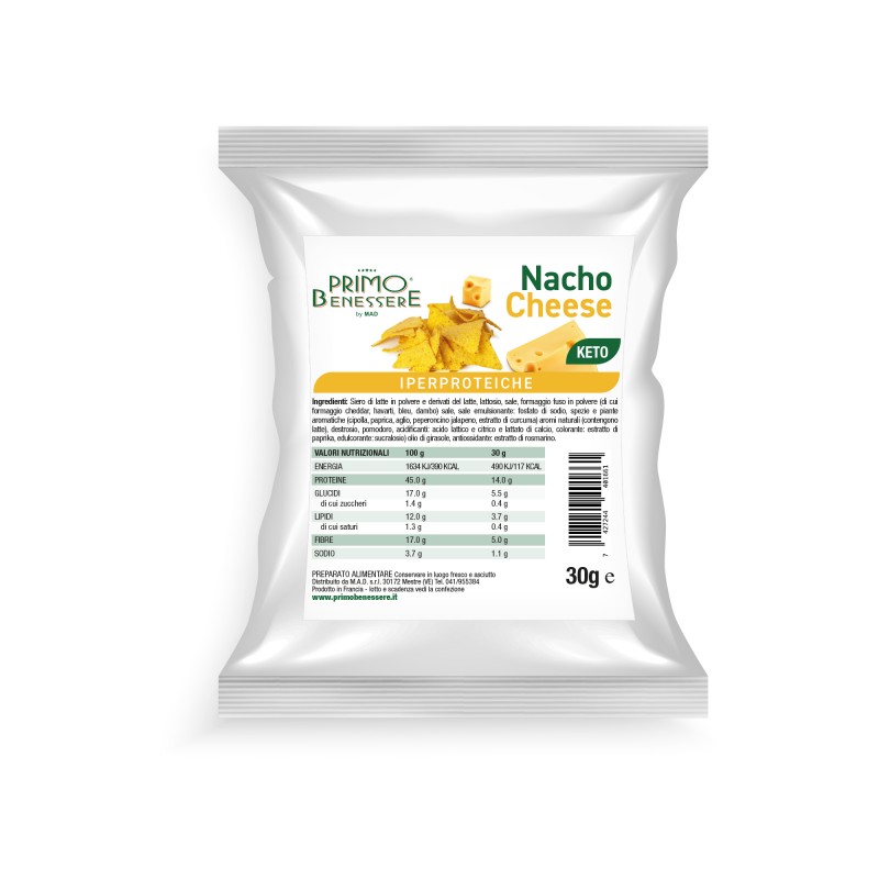 Degli Snack Iperproteici per un aperitivo dimagrante o uno spuntino light diverso dal solito. Ideali per la FASE 1, potrai assaportare le tue Patatine gusto NACHO CHEESE iperproteiche ad ogni momento della giornata o come spuntino/merenda