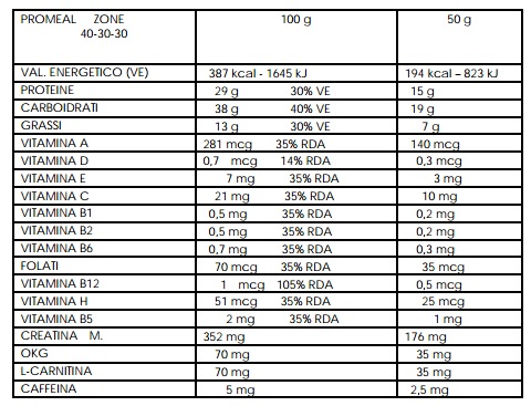 Ingredienti: sciroppo di fruttosio, proteine del latte, cioccolato (cacao min.28%), grassi vegetali non idrogenati (cocco,mais, extravergine di oliva), yogurt di latte (solo nel gusto yogurt), cereali (solo nel gusto cereali): riso, frumento, orzo, farina di cocco (solo nel gusto cocco), maltodestrine, albume dell'uovo, creatina monoidrato, polpa di fragola (solo nel gusto fragola), emulsionante lecticina di soia (E322), colorante E120 (solo nel gusto fragola), aroma, magnesio carbonato, L-carnitina tartrato, L-ornitina, sodio cloruro, potassio cloruro, cola e.s.t., guaranà e.s.t., vitamine C, E, PP, B5, B6, B1, folati, H, ferro solfato, betacarotene, zinco solfato.